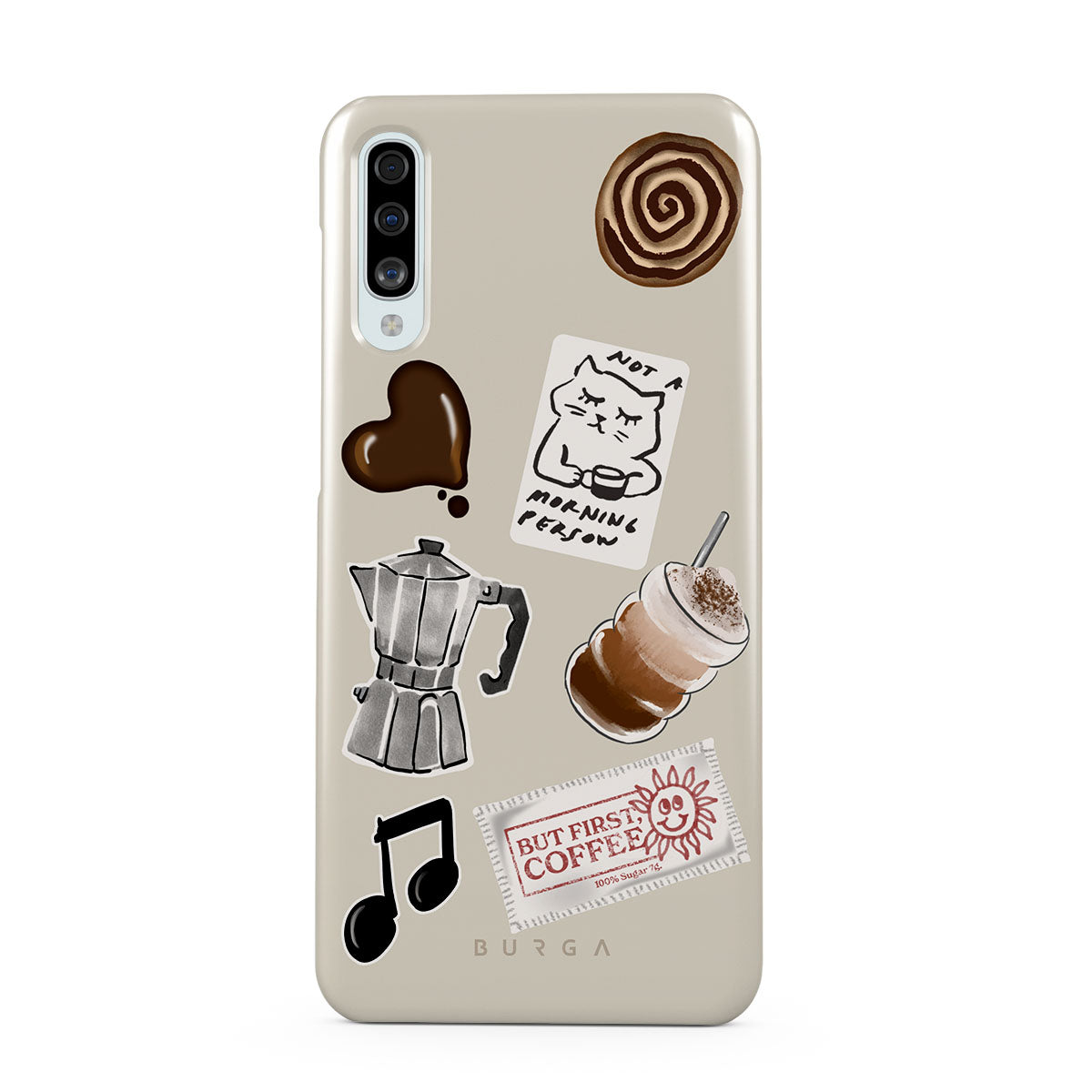 Główne elementy projektu: kawiarkę moka, frappé, cynamonową bułeczkę, czekoladowe serce, naklejkę „Not a morning person”, paragon „But First, Coffee”, nutkę muzyczną.