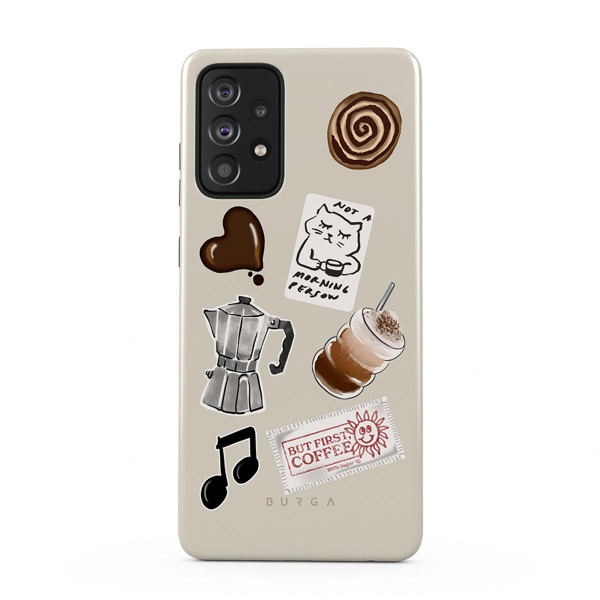 Główne elementy projektu: kawiarkę moka, frappé, cynamonową bułeczkę, czekoladowe serce, naklejkę „Not a morning person”, paragon „But First, Coffee”, nutkę muzyczną.