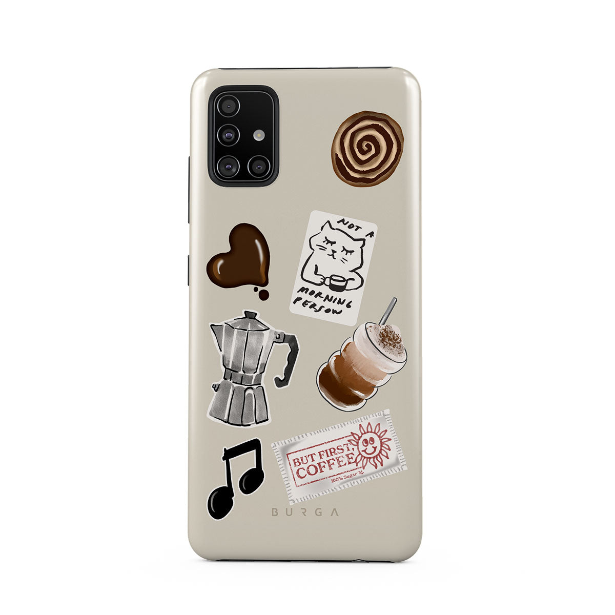 Główne elementy projektu: kawiarkę moka, frappé, cynamonową bułeczkę, czekoladowe serce, naklejkę „Not a morning person”, paragon „But First, Coffee”, nutkę muzyczną.