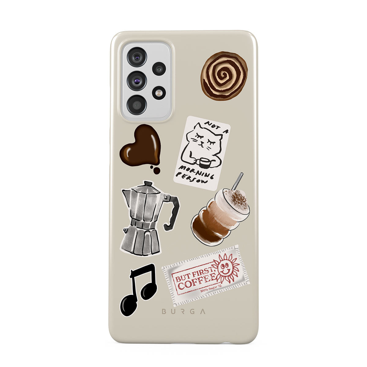 Główne elementy projektu: kawiarkę moka, frappé, cynamonową bułeczkę, czekoladowe serce, naklejkę „Not a morning person”, paragon „But First, Coffee”, nutkę muzyczną.