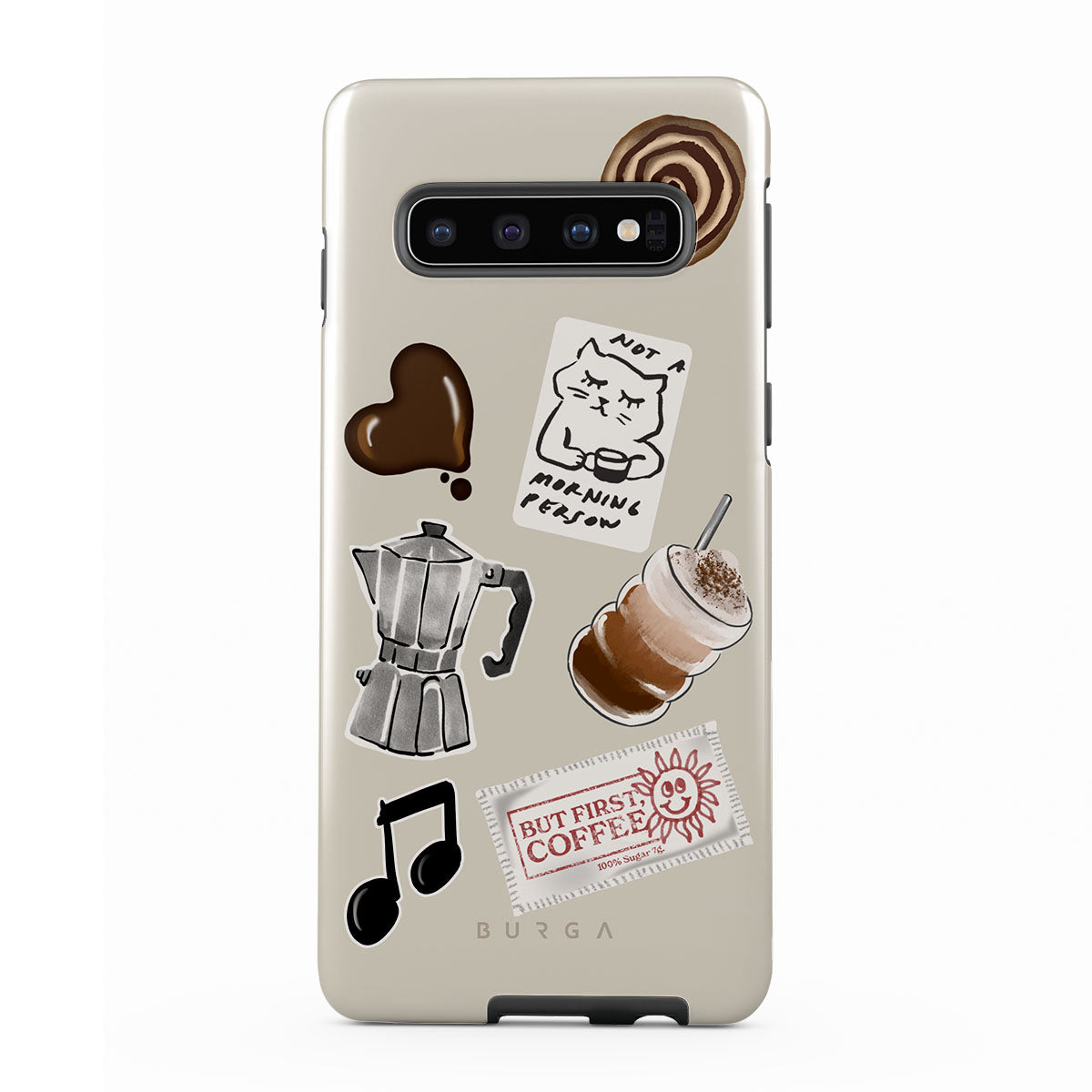 Główne elementy projektu: kawiarkę moka, frappé, cynamonową bułeczkę, czekoladowe serce, naklejkę „Not a morning person”, paragon „But First, Coffee”, nutkę muzyczną.