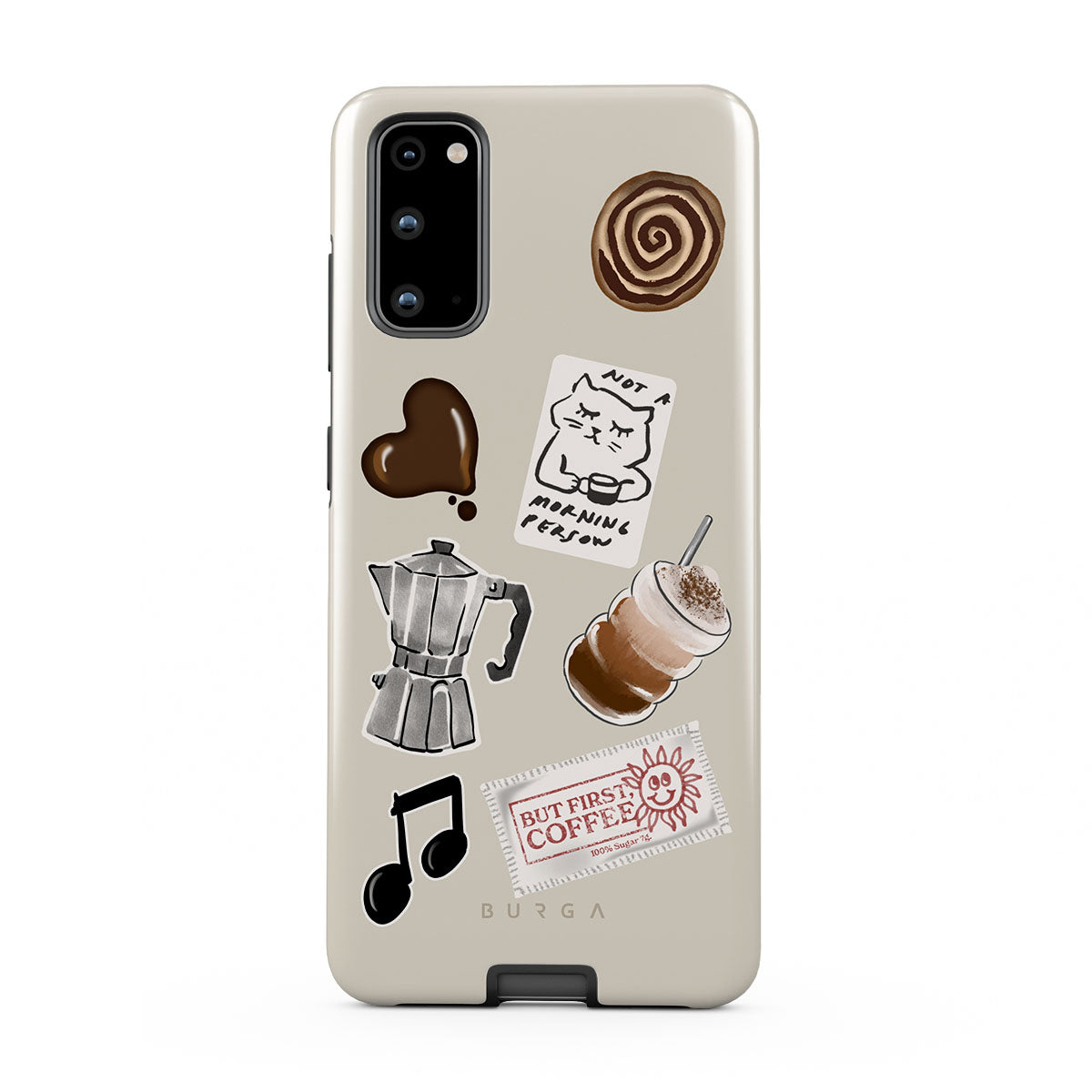 Główne elementy projektu: kawiarkę moka, frappé, cynamonową bułeczkę, czekoladowe serce, naklejkę „Not a morning person”, paragon „But First, Coffee”, nutkę muzyczną.