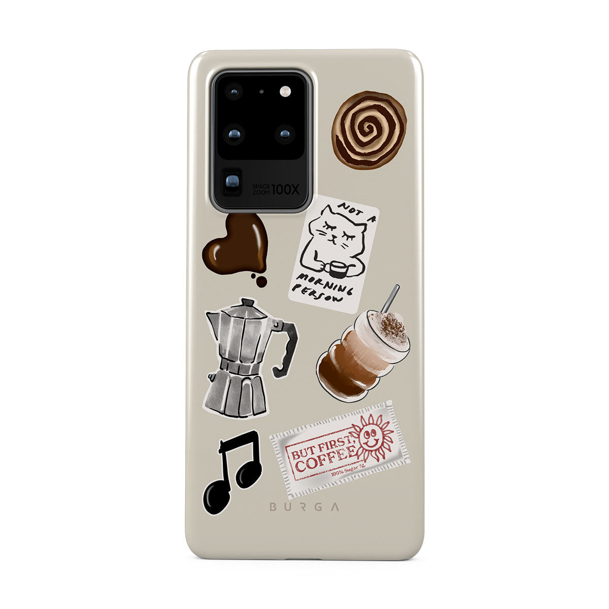 Główne elementy projektu: kawiarkę moka, frappé, cynamonową bułeczkę, czekoladowe serce, naklejkę „Not a morning person”, paragon „But First, Coffee”, nutkę muzyczną.