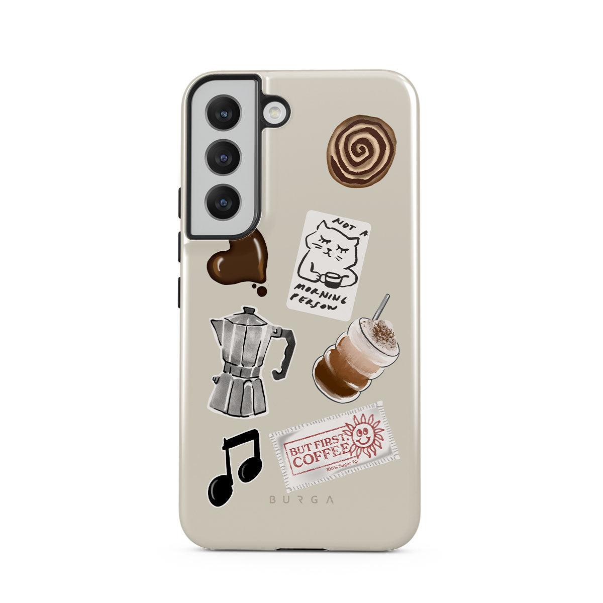 Główne elementy projektu: kawiarkę moka, frappé, cynamonową bułeczkę, czekoladowe serce, naklejkę „Not a morning person”, paragon „But First, Coffee”, nutkę muzyczną.