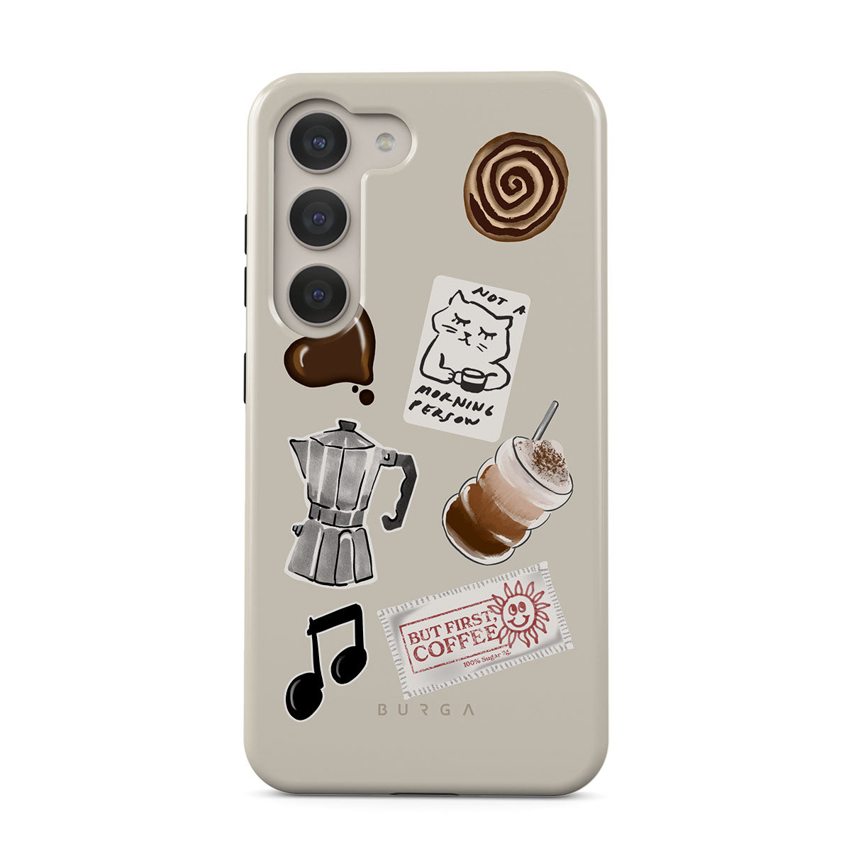 Główne elementy projektu: kawiarkę moka, frappé, cynamonową bułeczkę, czekoladowe serce, naklejkę „Not a morning person”, paragon „But First, Coffee”, nutkę muzyczną.