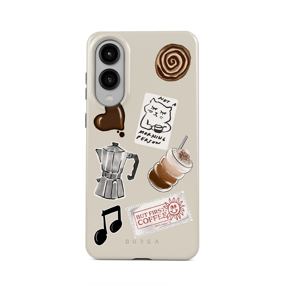 Główne elementy projektu: kawiarkę moka, frappé, cynamonową bułeczkę, czekoladowe serce, naklejkę „Not a morning person”, paragon „But First, Coffee”, nutkę muzyczną.