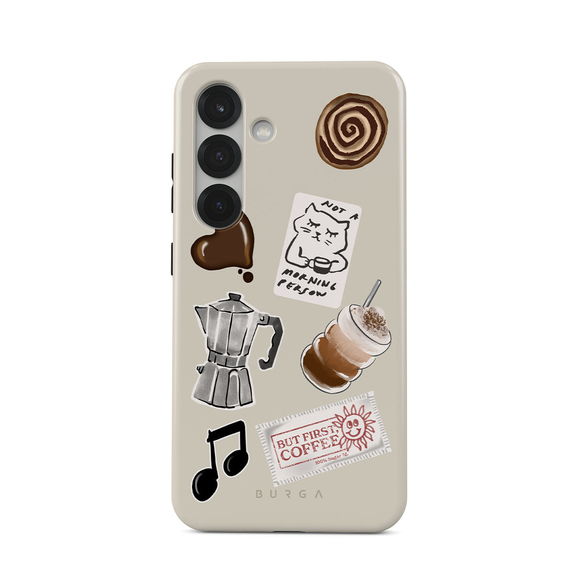 Główne elementy projektu: kawiarkę moka, frappé, cynamonową bułeczkę, czekoladowe serce, naklejkę „Not a morning person”, paragon „But First, Coffee”, nutkę muzyczną.