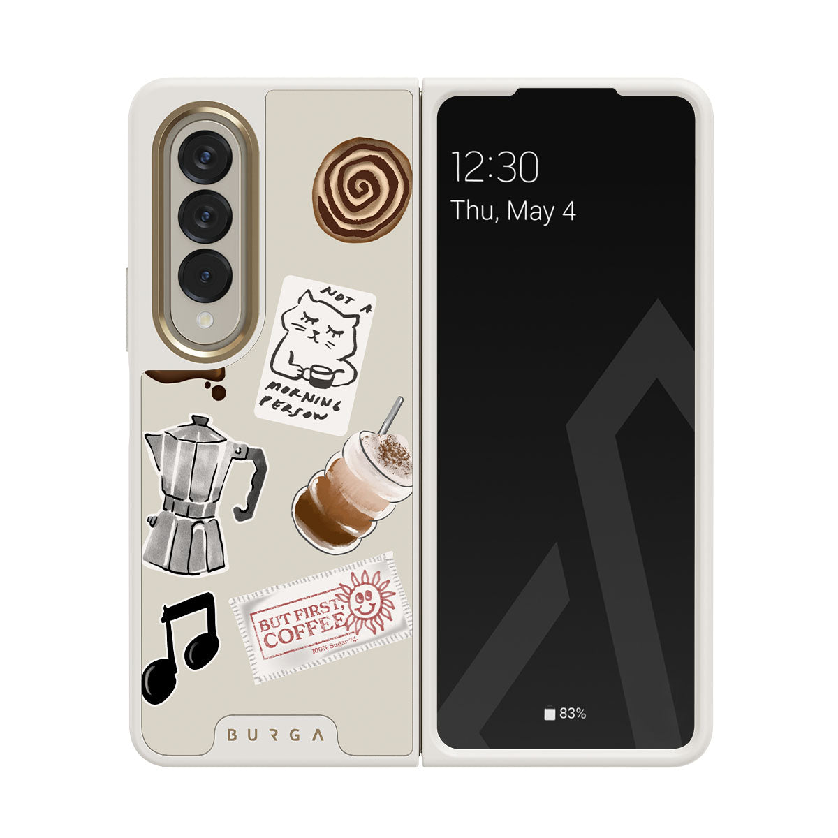 Główne elementy projektu: kawiarkę moka, frappé, cynamonową bułeczkę, czekoladowe serce, naklejkę „Not a morning person”, paragon „But First, Coffee”, nutkę muzyczną.