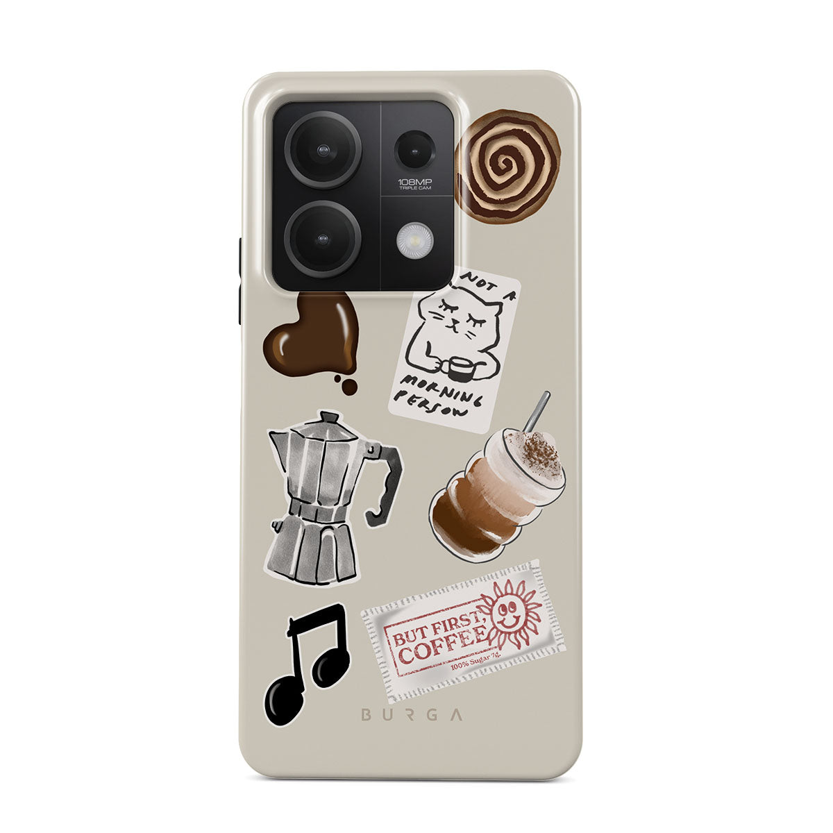 Główne elementy projektu: kawiarkę moka, frappé, cynamonową bułeczkę, czekoladowe serce, naklejkę „Not a morning person”, paragon „But First, Coffee”, nutkę muzyczną.