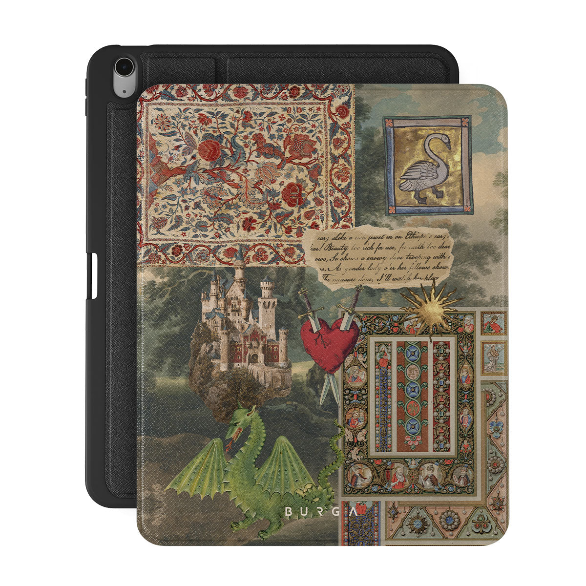 Główne elementy projektu: odręczna czcionka kaligrafowana, nadruk w stylu retro, średniowieczny wzór, motyw kwiatowy, ilustracje ze starych książek, serce, smok, zamek