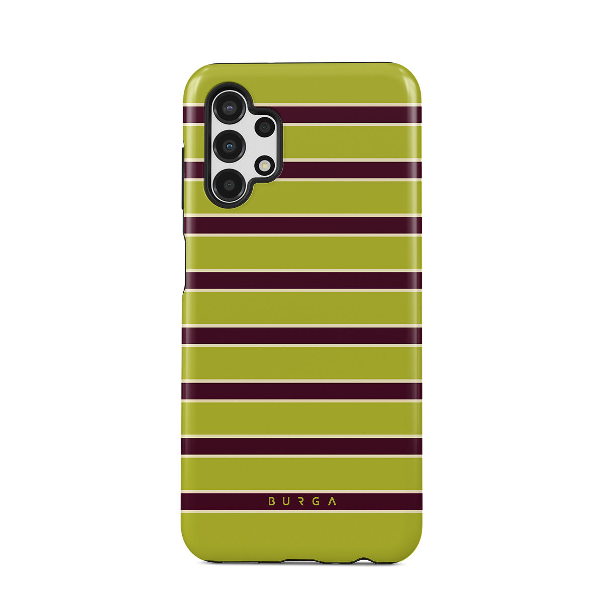 Główne elementy projektu: grube poziome paski w limonkowej zieleni i bordo.