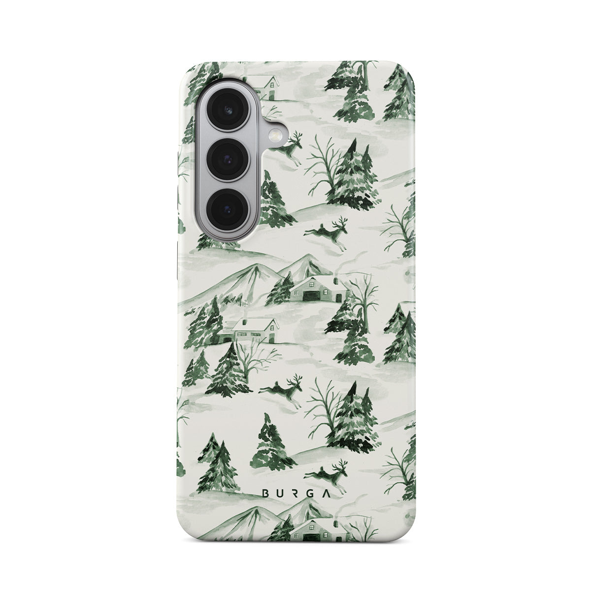 Główne elementy projektu: zimowa scena leśna, sosny, zaśnieżony krajobraz, zielono-biały, wzór naturalny, leśne święta, wiecznie zielone drzewa, ilustracja w stylu vintage