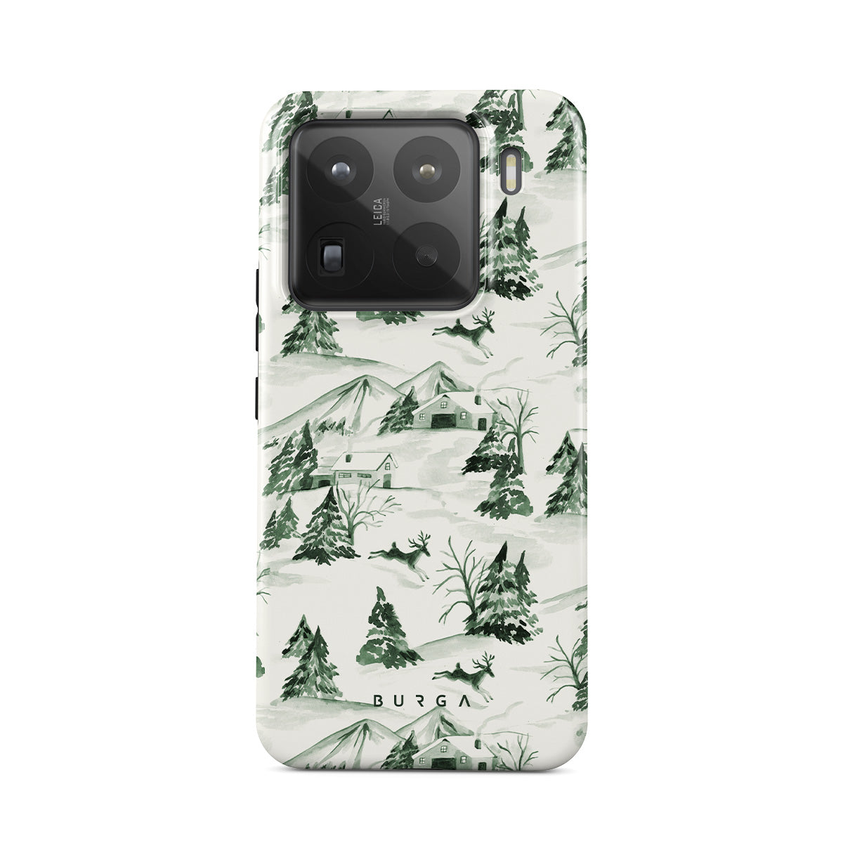 Główne elementy projektu: zimowa scena leśna, sosny, zaśnieżony krajobraz, zielono-biały, wzór naturalny, leśne święta, wiecznie zielone drzewa, ilustracja w stylu vintage