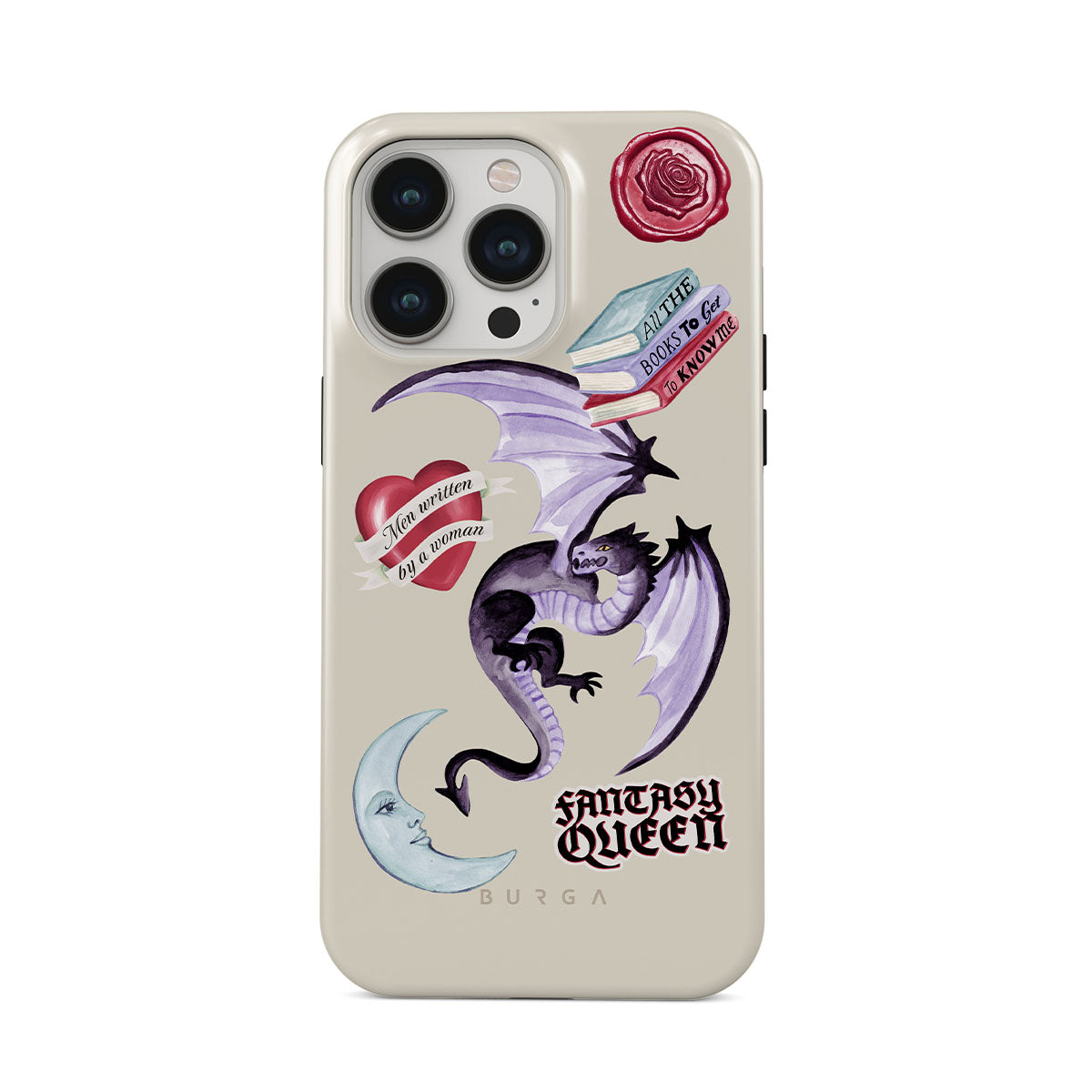 Główne elementy projektu: fioletowego smoka, naklejkę „Fantasy Queen”, półksiężyc, fioletową pieczęć woskową, serce z wiadomością, książki.