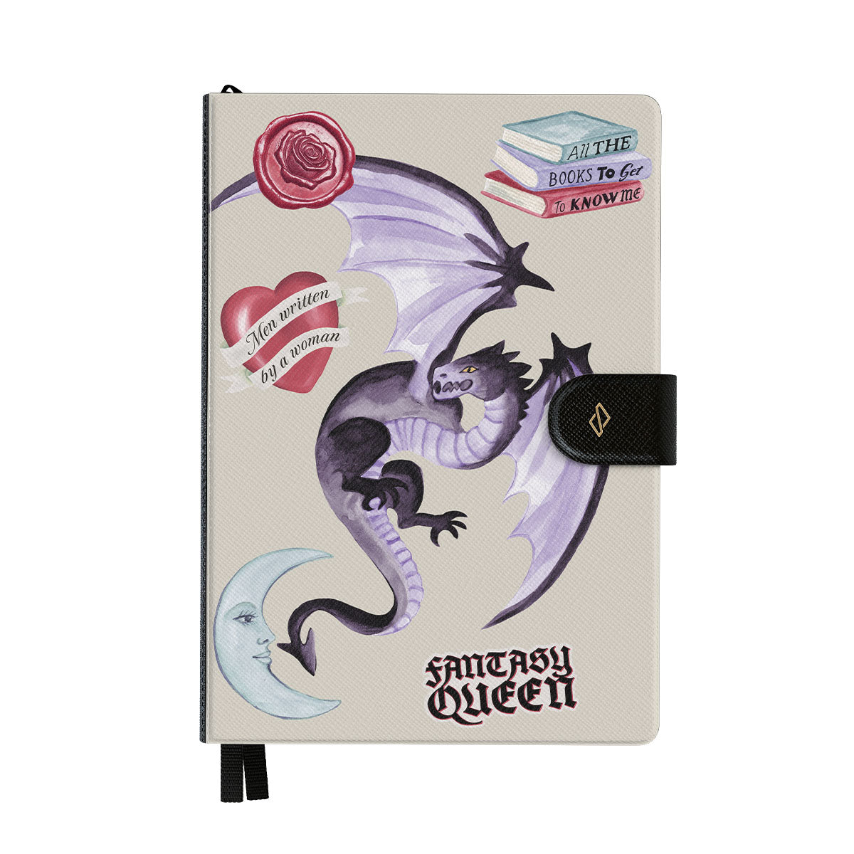 Główne elementy projektu: fioletowego smoka, naklejkę „Fantasy Queen”, półksiężyc, fioletową pieczęć woskową, serce z wiadomością, książki.