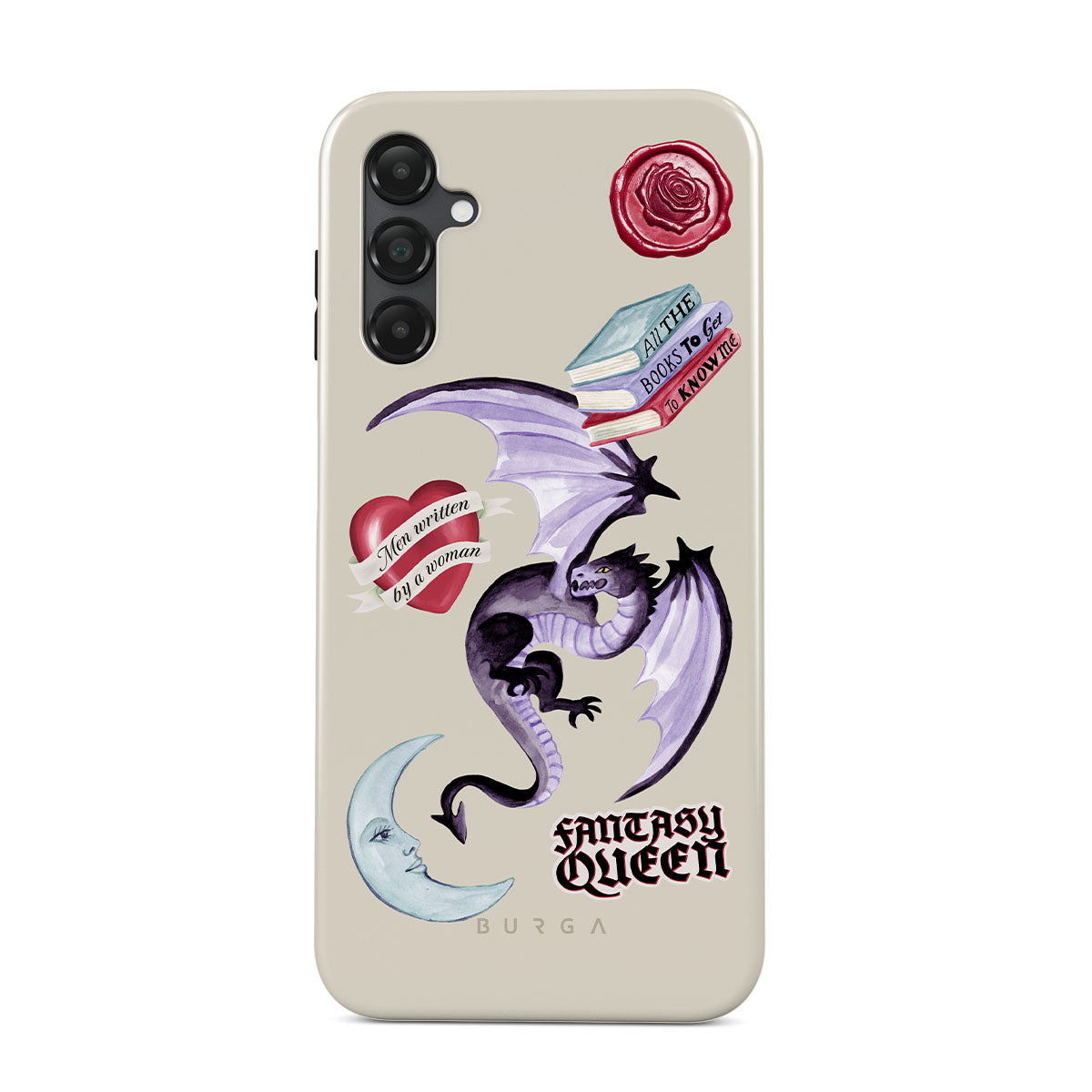 Główne elementy projektu: fioletowego smoka, naklejkę „Fantasy Queen”, półksiężyc, fioletową pieczęć woskową, serce z wiadomością, książki.