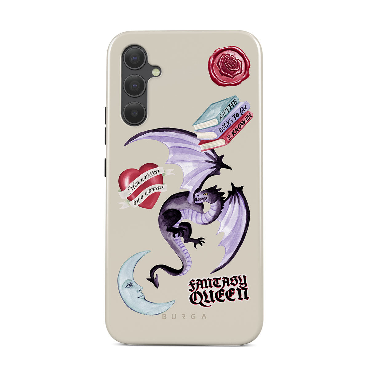 Główne elementy projektu: fioletowego smoka, naklejkę „Fantasy Queen”, półksiężyc, fioletową pieczęć woskową, serce z wiadomością, książki.