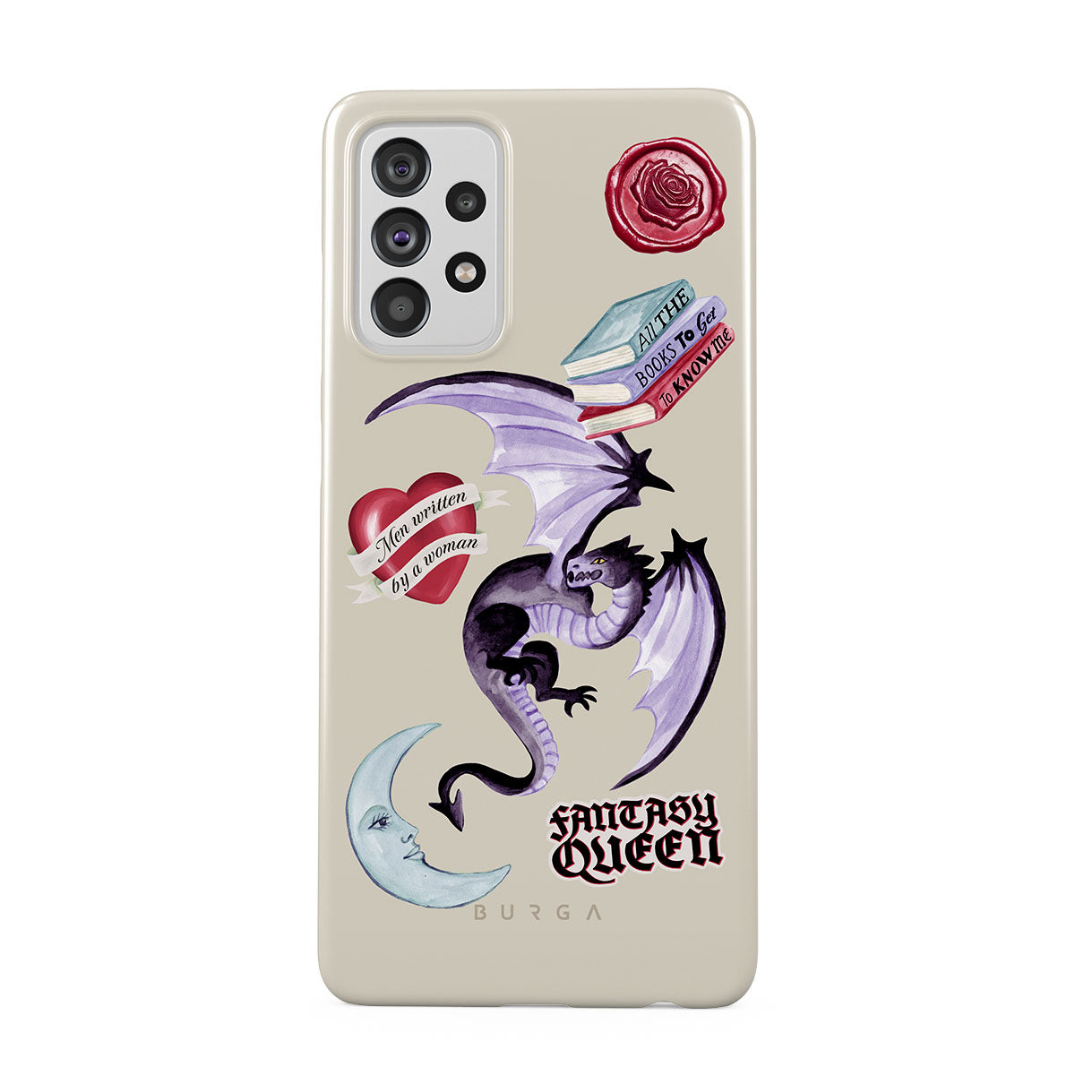 Główne elementy projektu: fioletowego smoka, naklejkę „Fantasy Queen”, półksiężyc, fioletową pieczęć woskową, serce z wiadomością, książki.