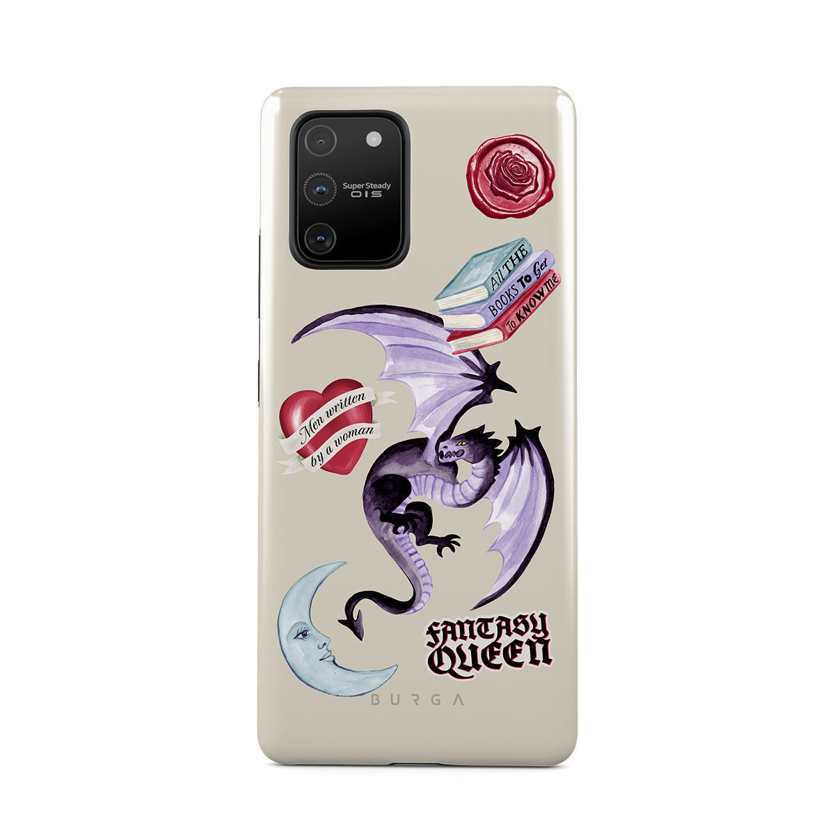 Główne elementy projektu: fioletowego smoka, naklejkę „Fantasy Queen”, półksiężyc, fioletową pieczęć woskową, serce z wiadomością, książki.