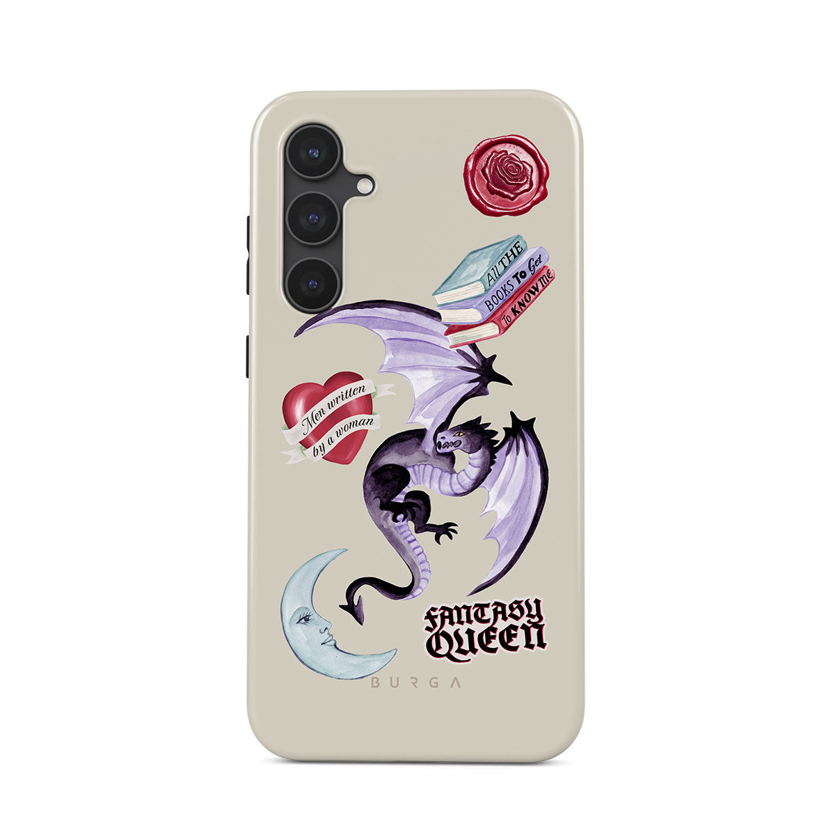 Główne elementy projektu: fioletowego smoka, naklejkę „Fantasy Queen”, półksiężyc, fioletową pieczęć woskową, serce z wiadomością, książki.
