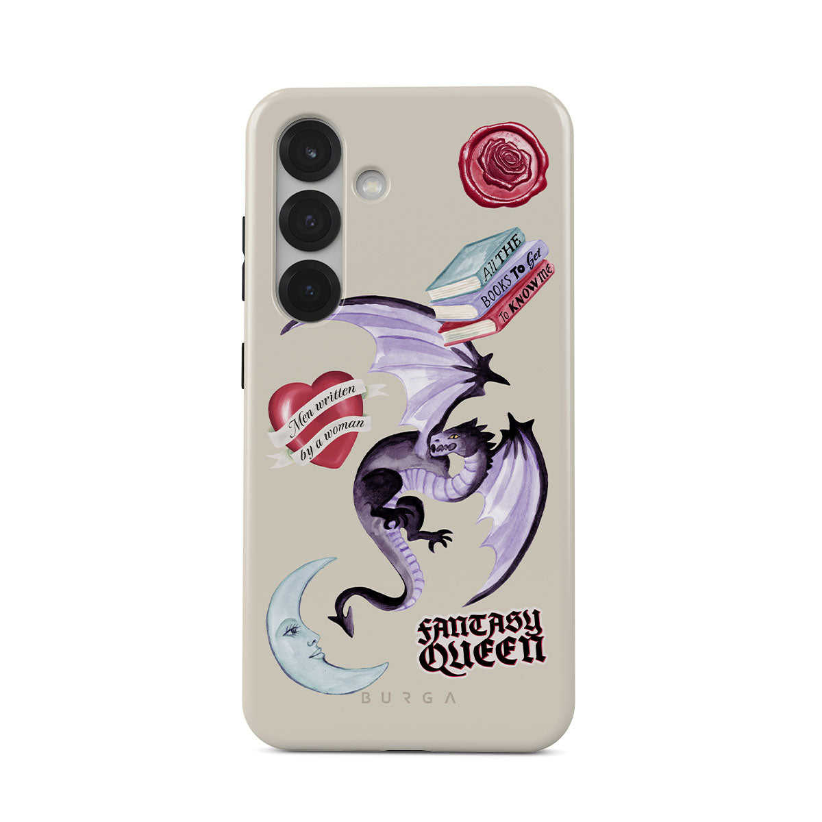 Główne elementy projektu: fioletowego smoka, naklejkę „Fantasy Queen”, półksiężyc, fioletową pieczęć woskową, serce z wiadomością, książki.