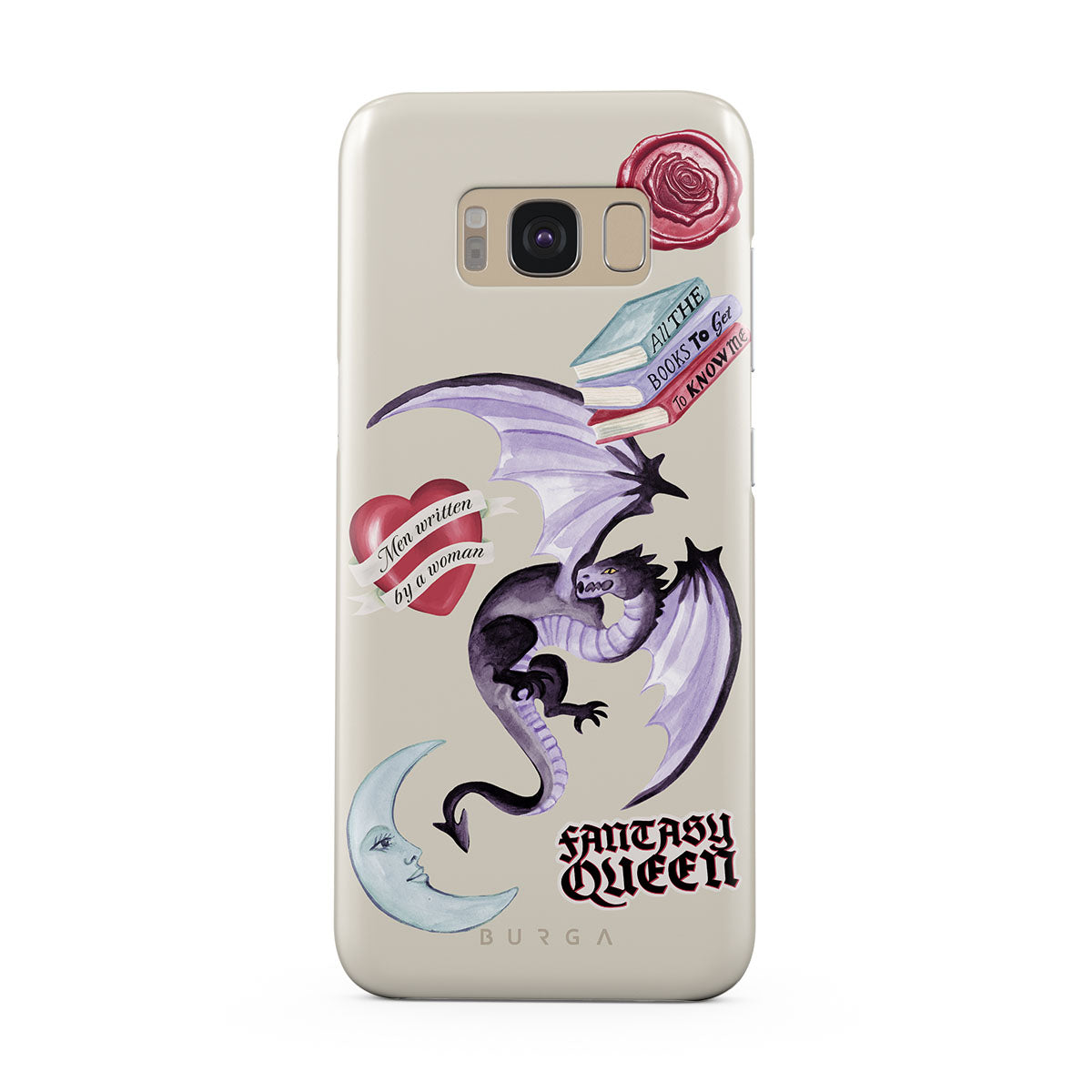 Główne elementy projektu: fioletowego smoka, naklejkę „Fantasy Queen”, półksiężyc, fioletową pieczęć woskową, serce z wiadomością, książki.