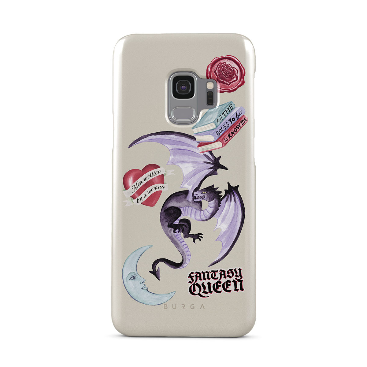 Główne elementy projektu: fioletowego smoka, naklejkę „Fantasy Queen”, półksiężyc, fioletową pieczęć woskową, serce z wiadomością, książki.