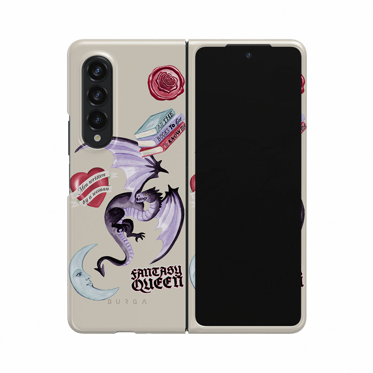 Główne elementy projektu: fioletowego smoka, naklejkę „Fantasy Queen”, półksiężyc, fioletową pieczęć woskową, serce z wiadomością, książki.