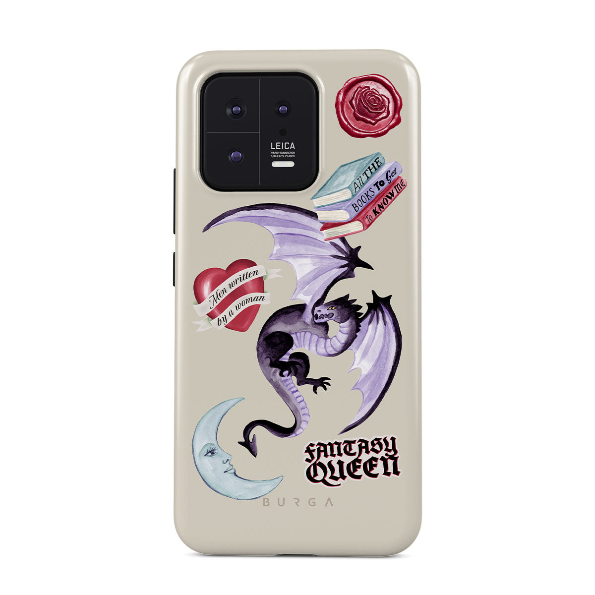 Główne elementy projektu: fioletowego smoka, naklejkę „Fantasy Queen”, półksiężyc, fioletową pieczęć woskową, serce z wiadomością, książki.