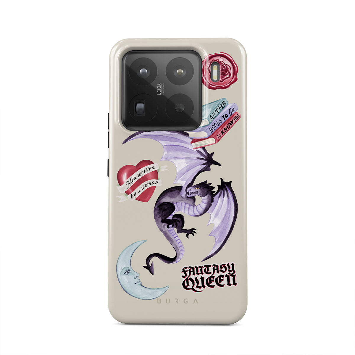 Główne elementy projektu: fioletowego smoka, naklejkę „Fantasy Queen”, półksiężyc, fioletową pieczęć woskową, serce z wiadomością, książki.