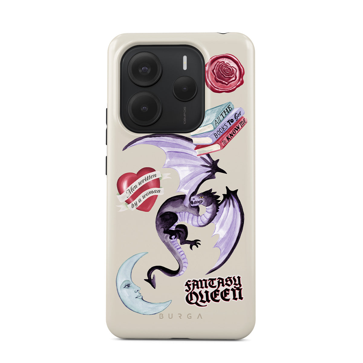 Główne elementy projektu: fioletowego smoka, naklejkę „Fantasy Queen”, półksiężyc, fioletową pieczęć woskową, serce z wiadomością, książki.