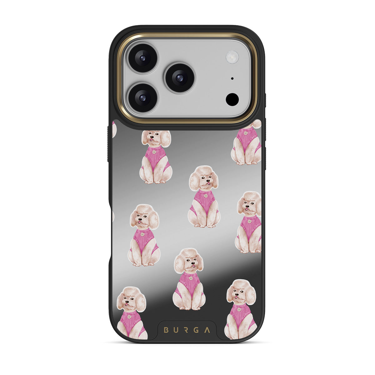 Główne elementy projektu: pudle, psy, zwierzęta domowe, różowe detale, lustro