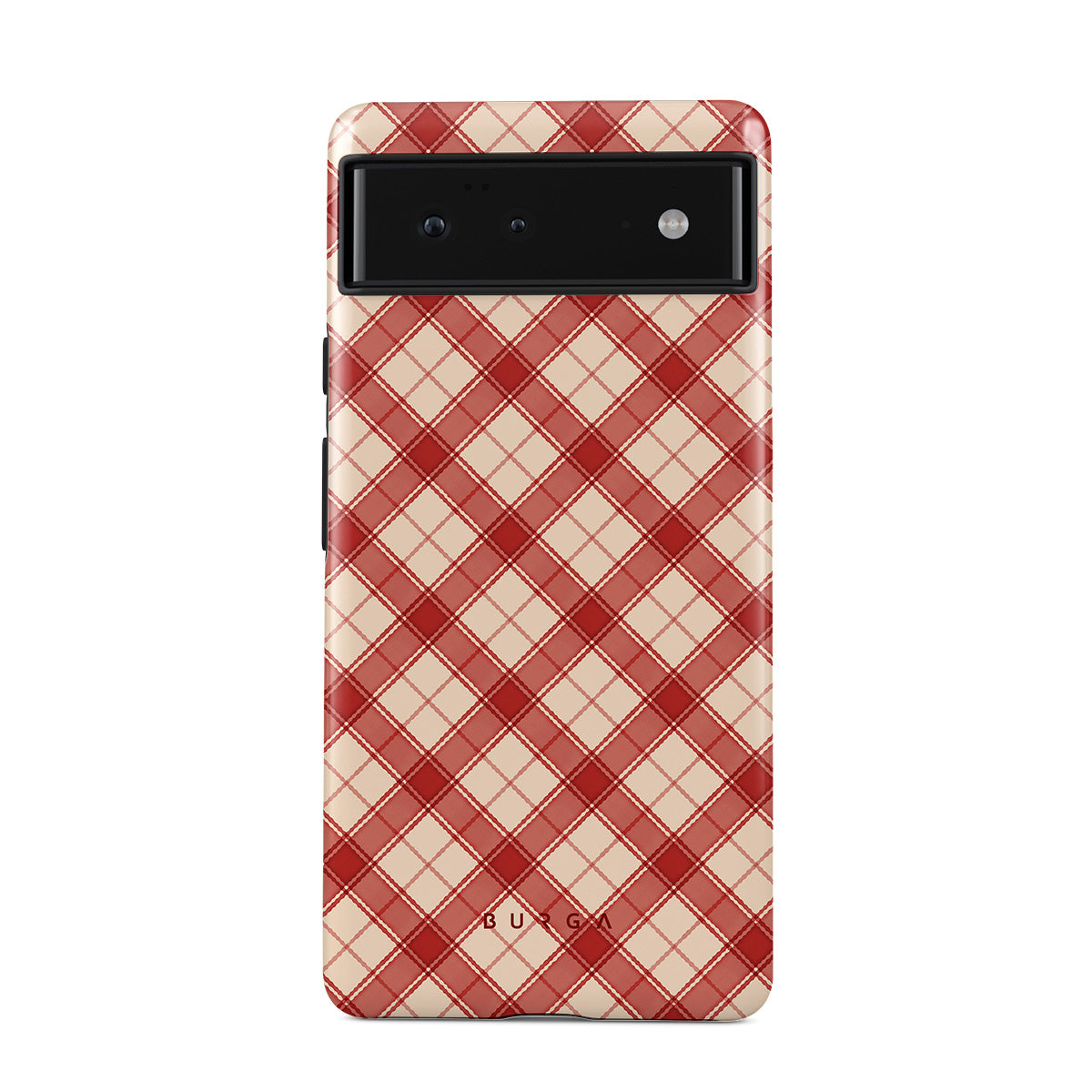 Główne elementy projektu: czerwona i brązowa kratka, ukośny wzór kratki, klasyczny tartan, styl buffalo check, tradycyjna świąteczna kratka