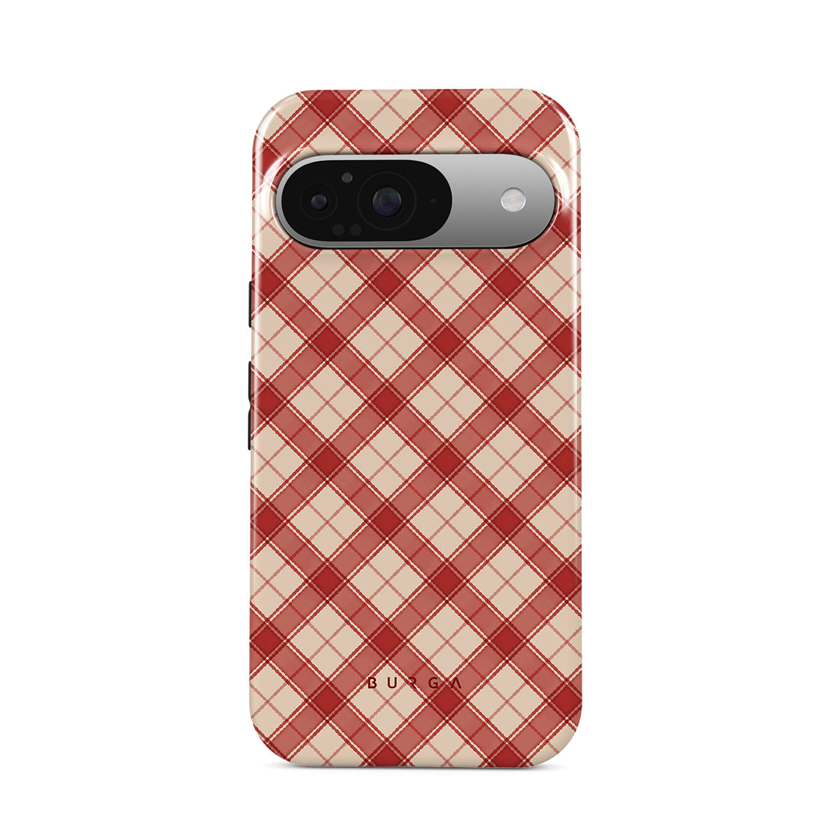 Główne elementy projektu: czerwona i brązowa kratka, ukośny wzór kratki, klasyczny tartan, styl buffalo check, tradycyjna świąteczna kratka