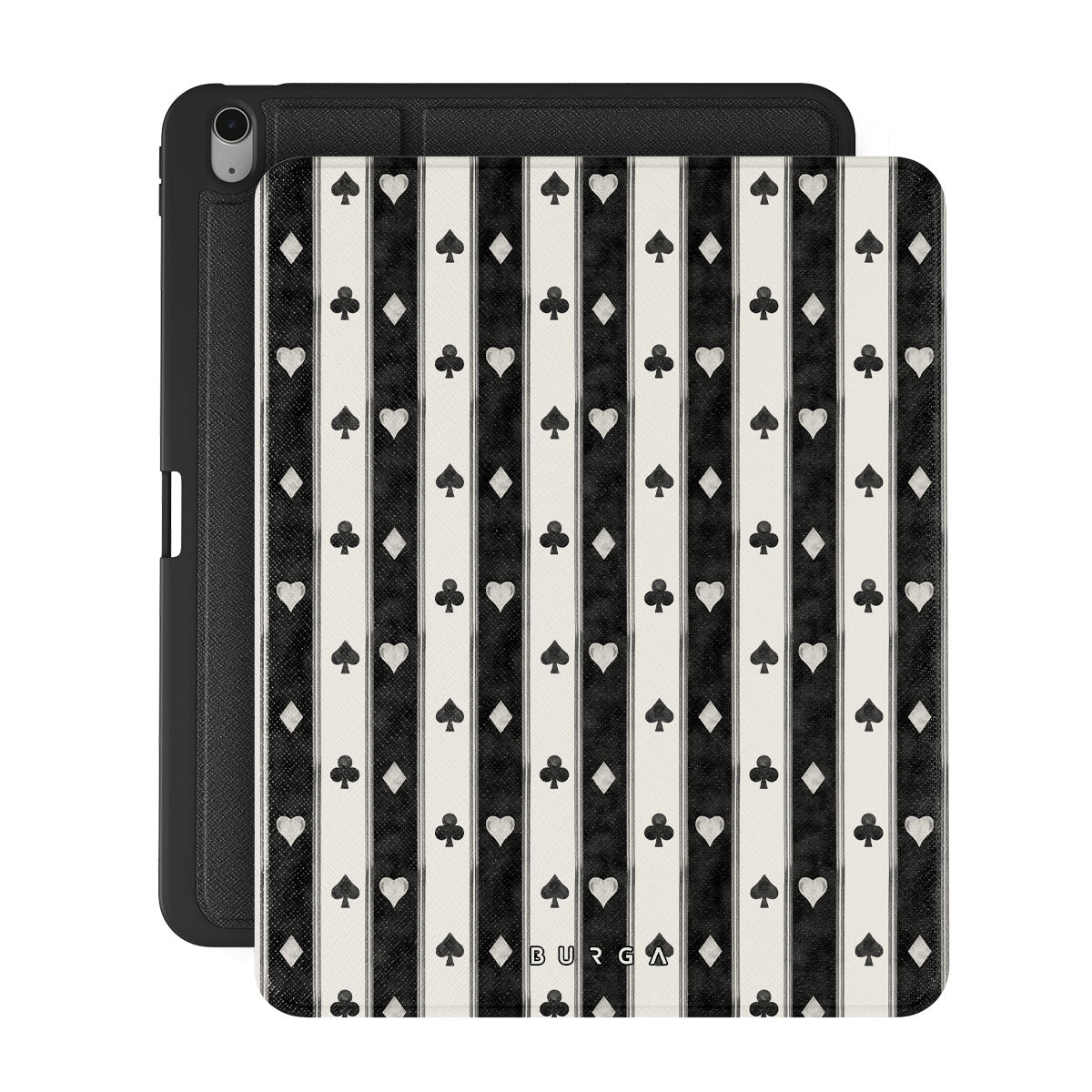 Główne elementy projektu: czarno-białe paski, serca, symbole kart, vintage styl