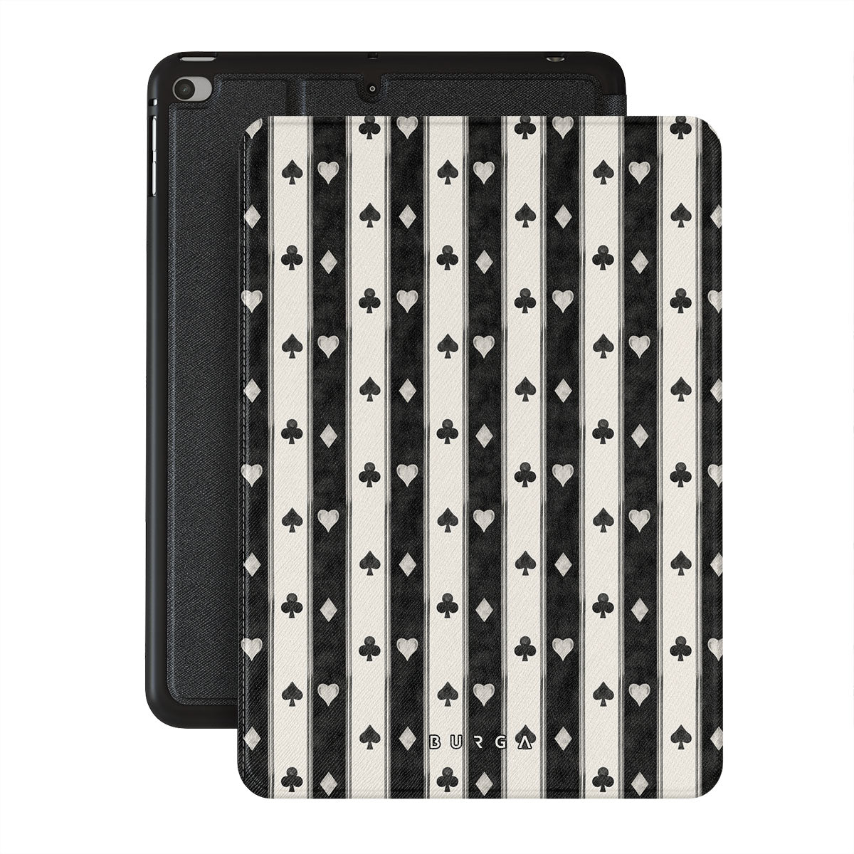 Główne elementy projektu: czarno-białe paski, serca, symbole kart, vintage styl