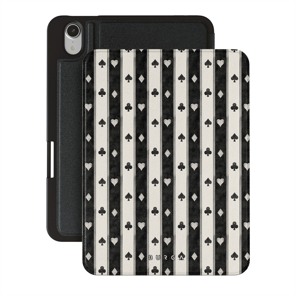 Główne elementy projektu: czarno-białe paski, serca, symbole kart, vintage styl