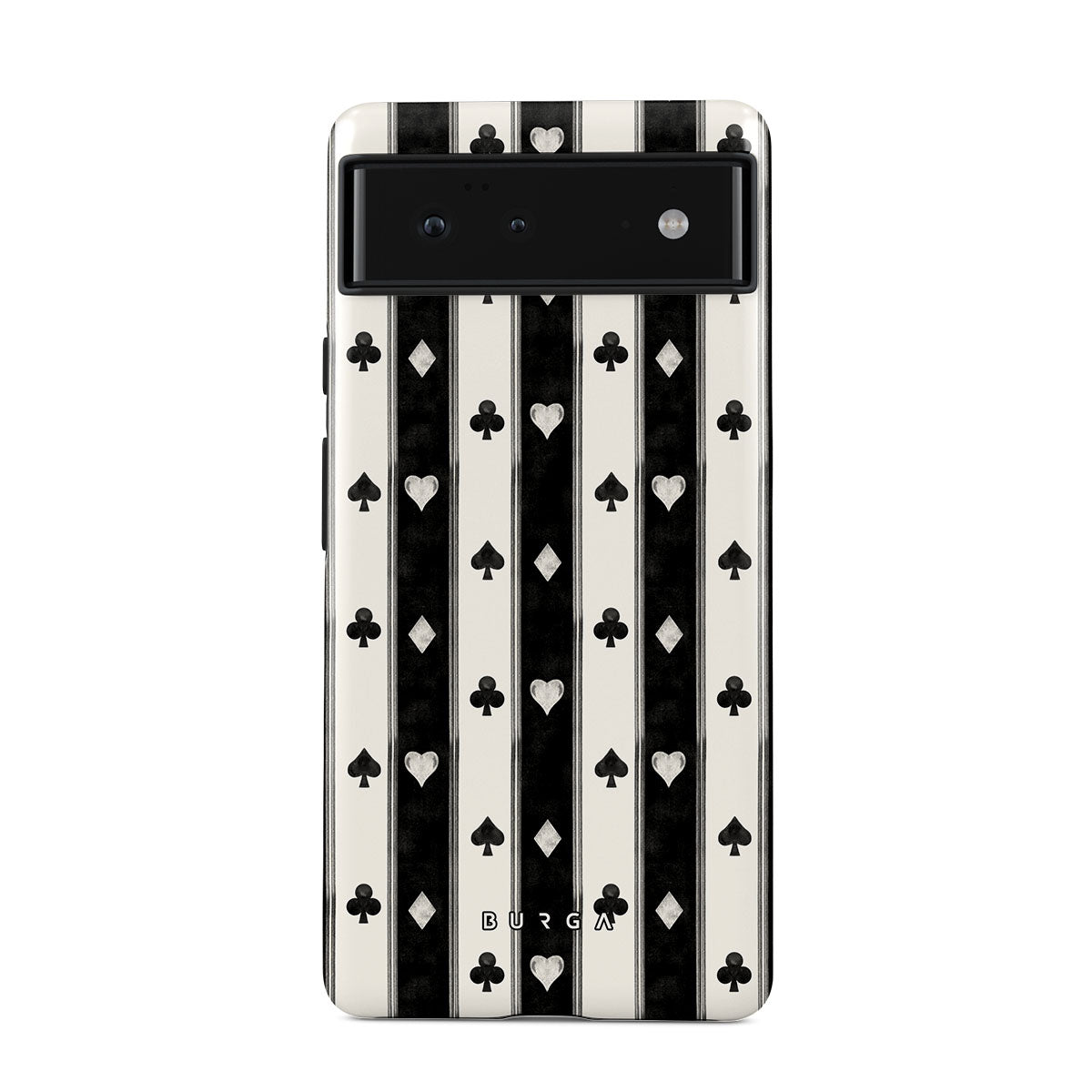 Główne elementy projektu: czarno-białe paski, serca, symbole kart, vintage styl