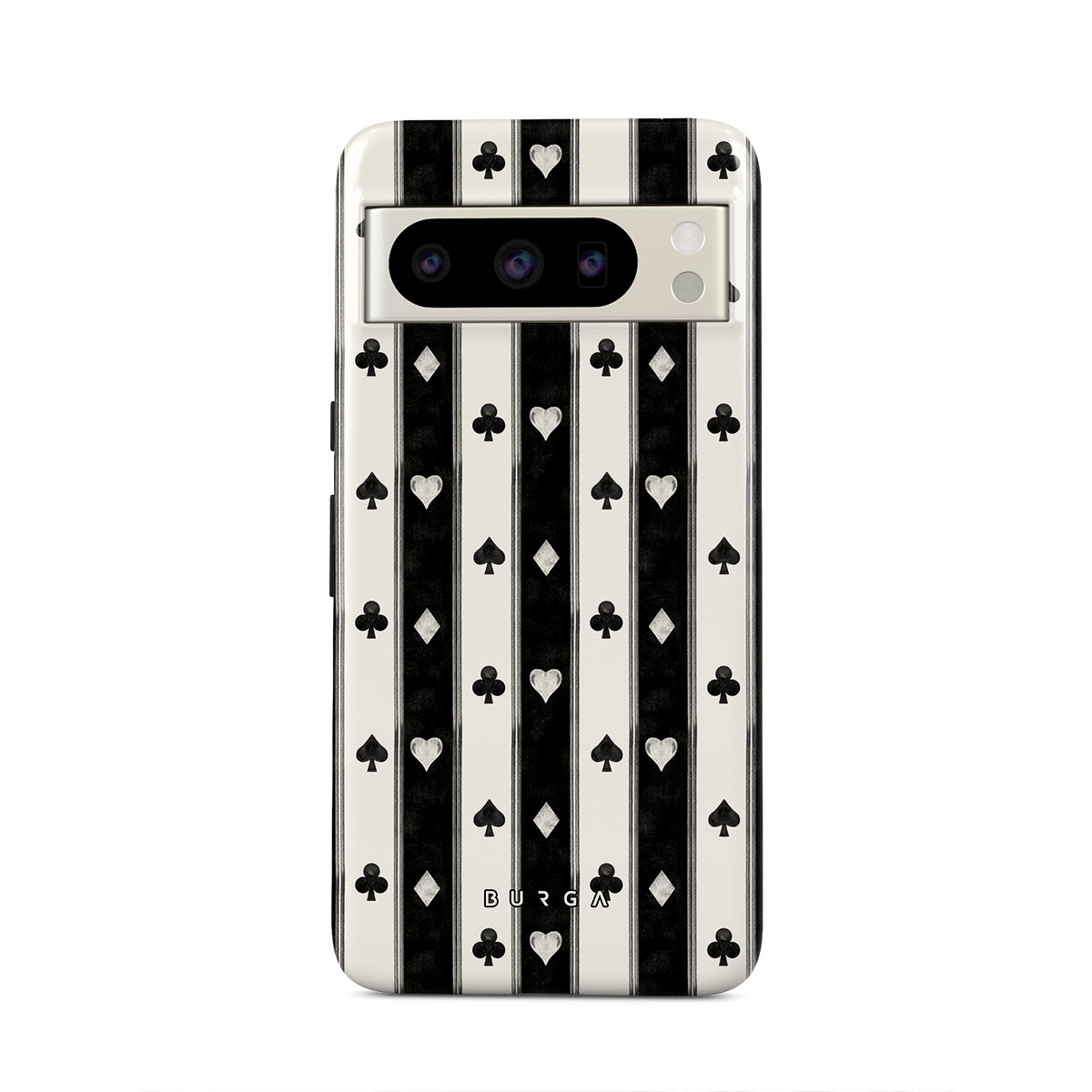 Główne elementy projektu: czarno-białe paski, serca, symbole kart, vintage styl
