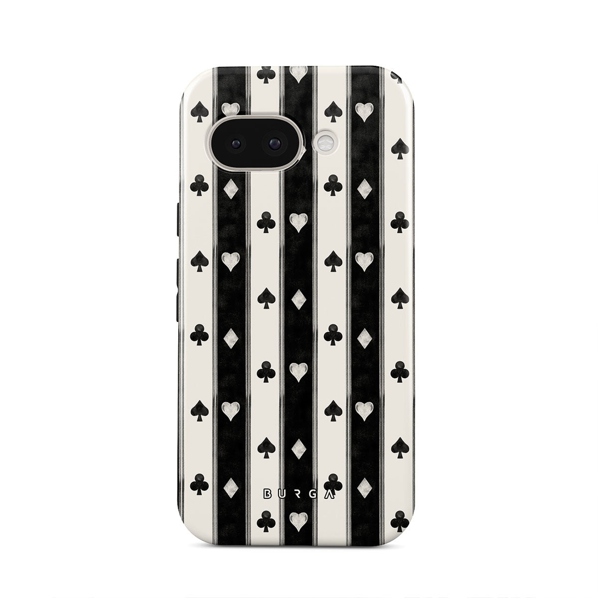 Główne elementy projektu: czarno-białe paski, serca, symbole kart, vintage styl