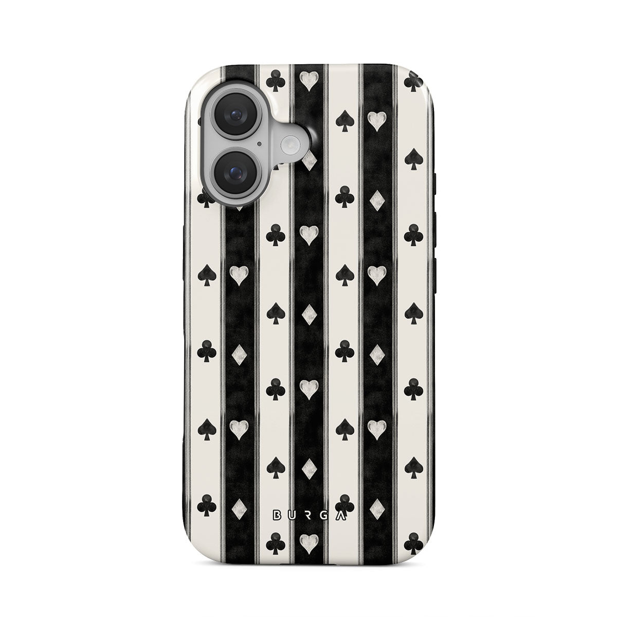 Główne elementy projektu: czarno-białe paski, serca, symbole kart, vintage styl
