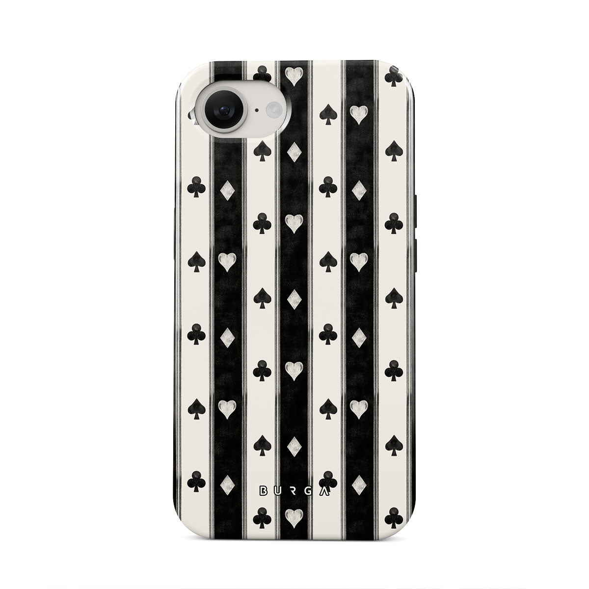 Główne elementy projektu: czarno-białe paski, serca, symbole kart, vintage styl