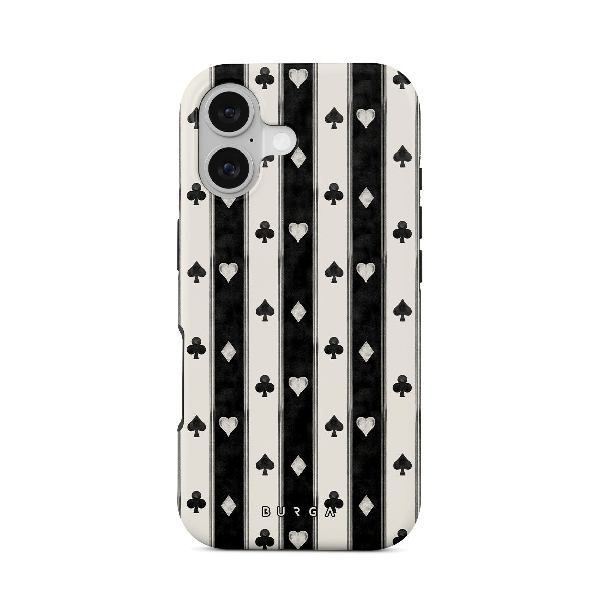 Główne elementy projektu: czarno-białe paski, serca, symbole kart, vintage styl