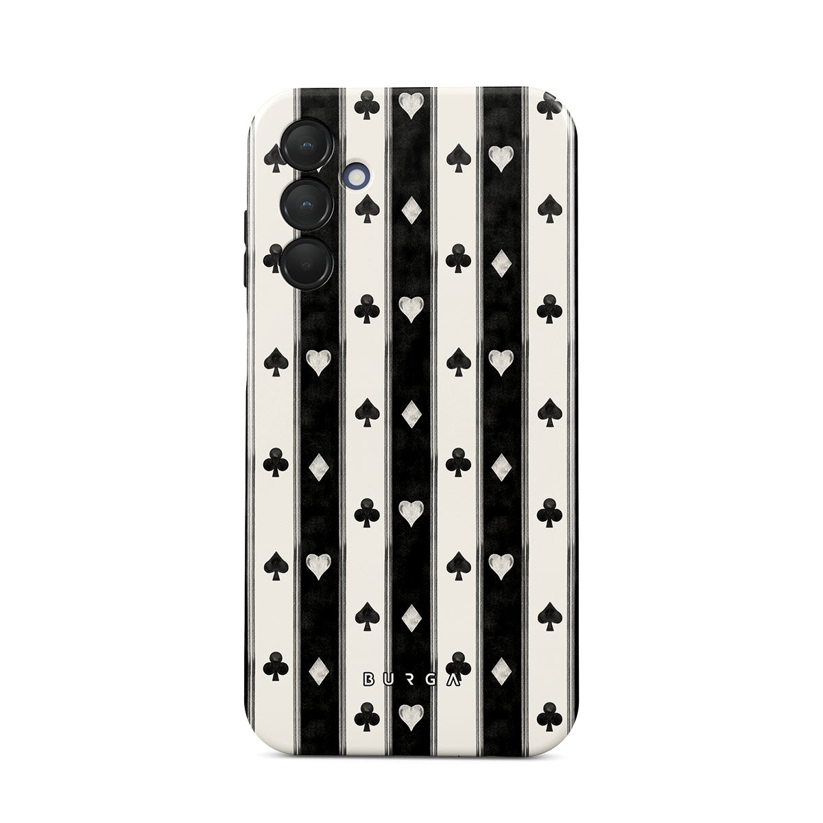 Główne elementy projektu: czarno-białe paski, serca, symbole kart, vintage styl