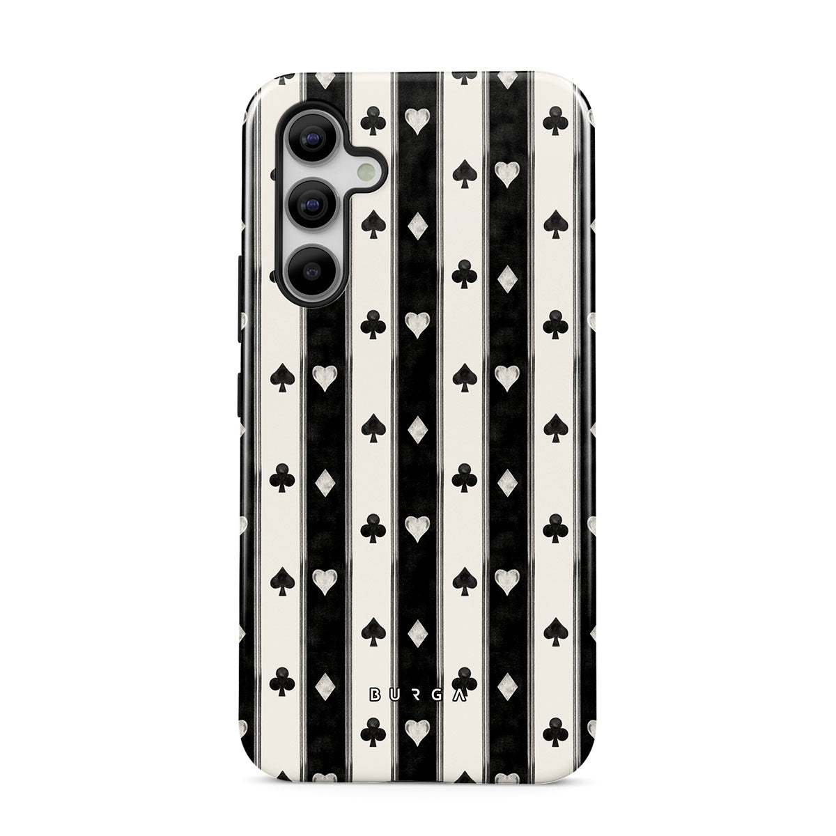 Główne elementy projektu: czarno-białe paski, serca, symbole kart, vintage styl