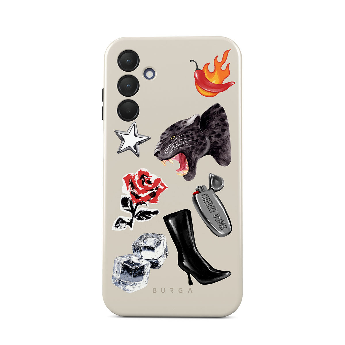 Główne elementy projektu: czarną panterę, czerwoną różę, płonącą paprykę, srebrną zapalniczkę, czarne kozaki do kolan, kostki lodu, srebrną gwiazdę.