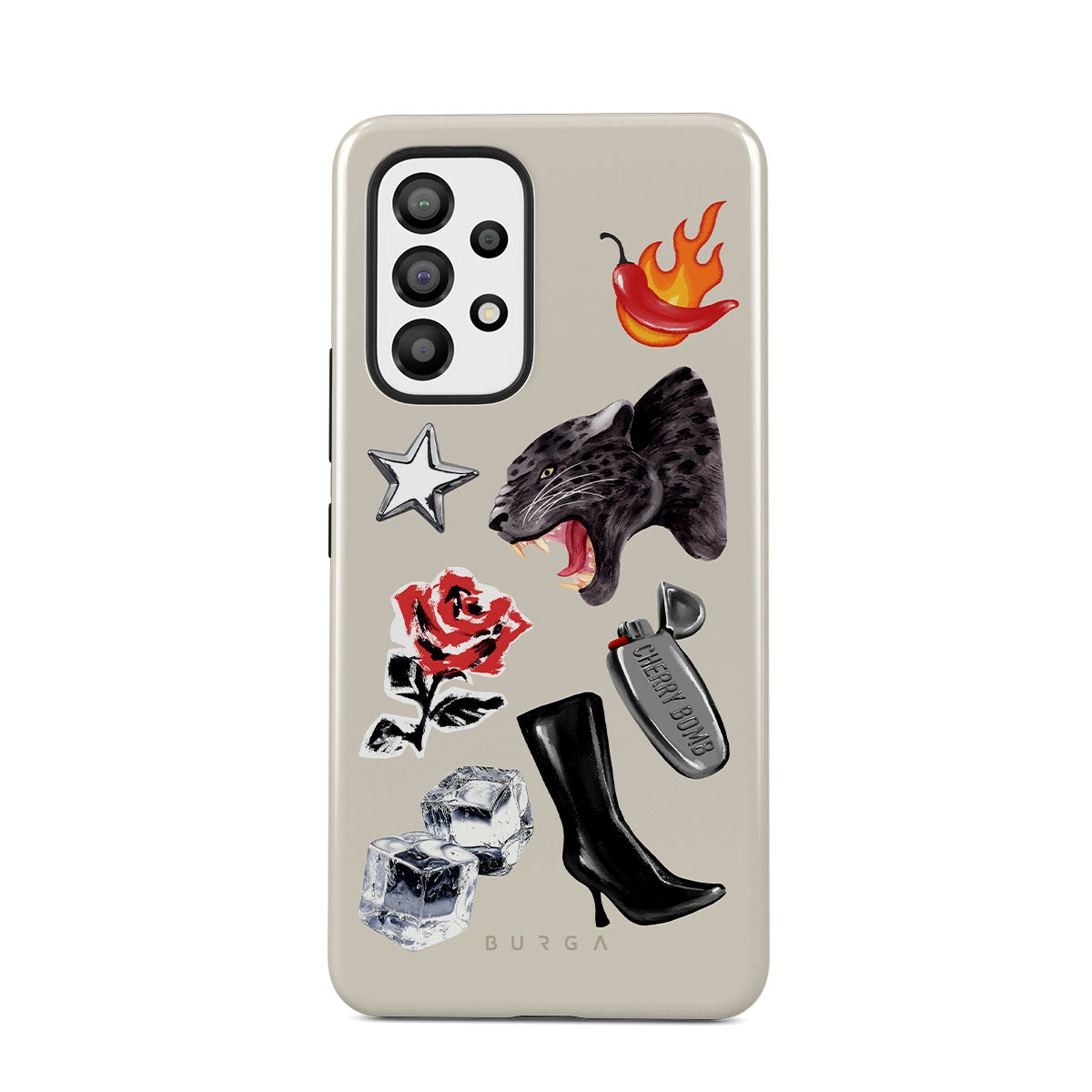 Główne elementy projektu: czarną panterę, czerwoną różę, płonącą paprykę, srebrną zapalniczkę, czarne kozaki do kolan, kostki lodu, srebrną gwiazdę.