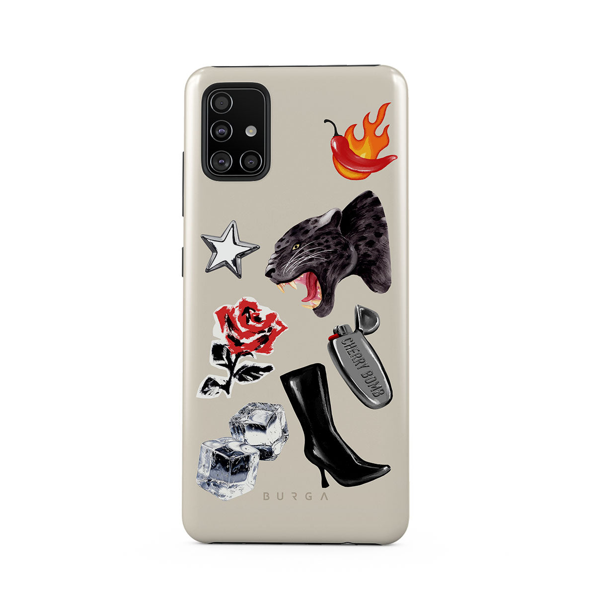 Główne elementy projektu: czarną panterę, czerwoną różę, płonącą paprykę, srebrną zapalniczkę, czarne kozaki do kolan, kostki lodu, srebrną gwiazdę.