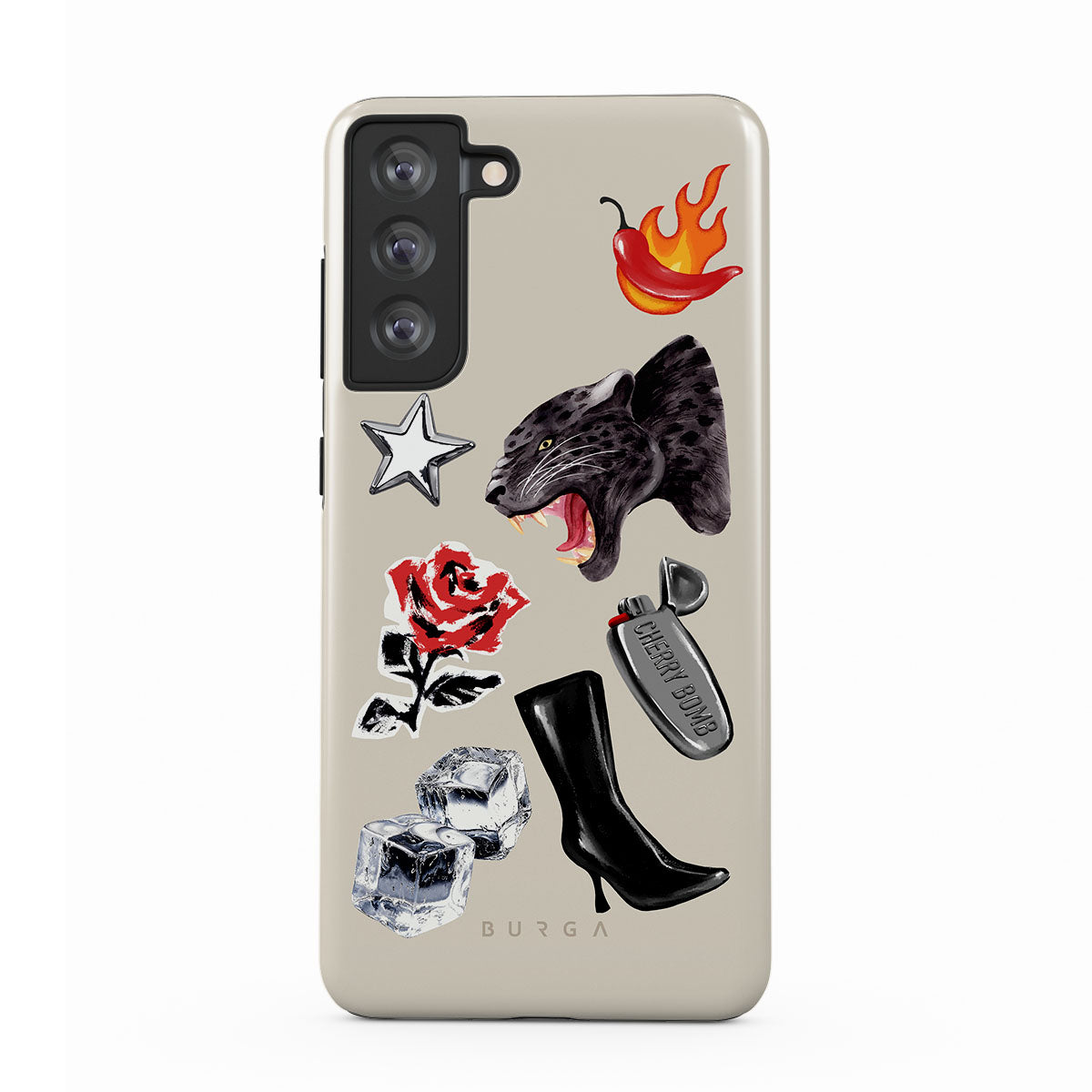 Główne elementy projektu: czarną panterę, czerwoną różę, płonącą paprykę, srebrną zapalniczkę, czarne kozaki do kolan, kostki lodu, srebrną gwiazdę.