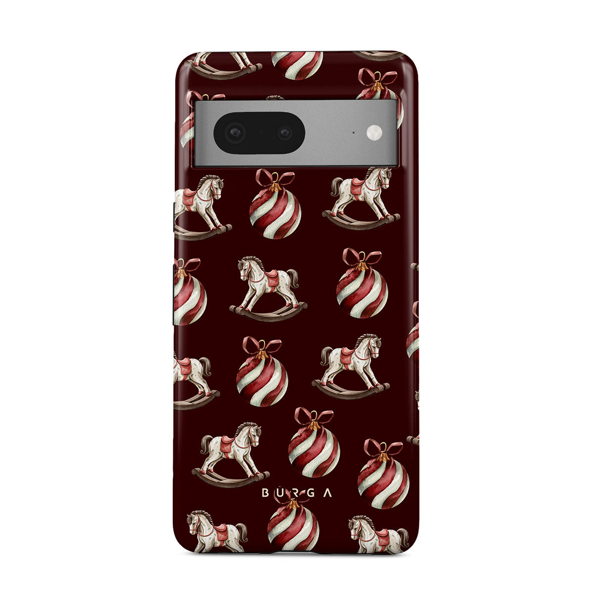 Główne elementy projektu: konie na biegunach, bombki, kolor czerwony, świąteczny wzór